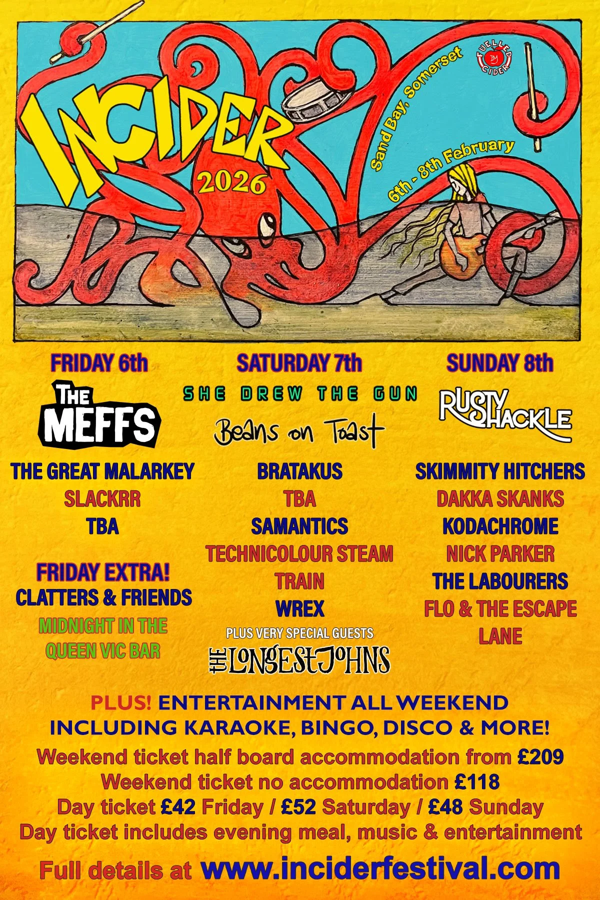 Live music from an incredible array of national acts including SHE DREW THE GUN, THE MEFFS, BEANS ON TOAST, THE LONGEST JOHNS, RUSTY SHACKLE, DAKKA SKANKS, SKIMMITY HITCHERS, NICK PARKER, THE GREAT MALARKEY, SAMANTICS, BRATAKUS, SLACKRR, THE SWAMP STOMP STRING BAND, TECHNICOLOUR STEAM TRAIN, THE LABOURERS, WREX, FLO & THE ESCAPE LANE, KODACHROME, CLATTERS & FRIENDS with more to be announced!